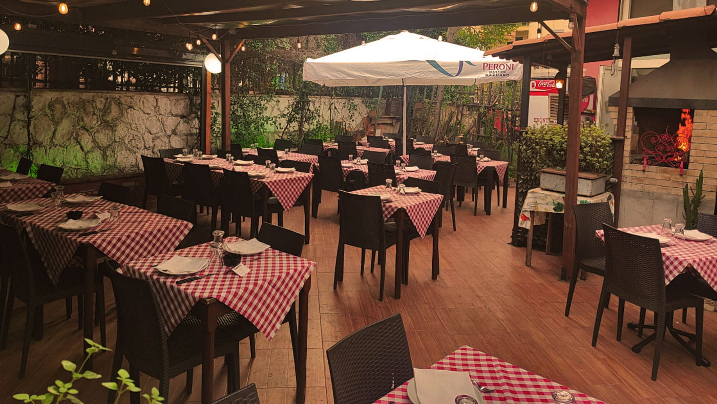 Nelle stagioni più miti, da maggio a novembre, i tavoli all’aperto offrono un angolo tranquillo e rilassato dove gustare una pizza appena sfornata o un piatto romano, in un contesto conviviale e piacevole.